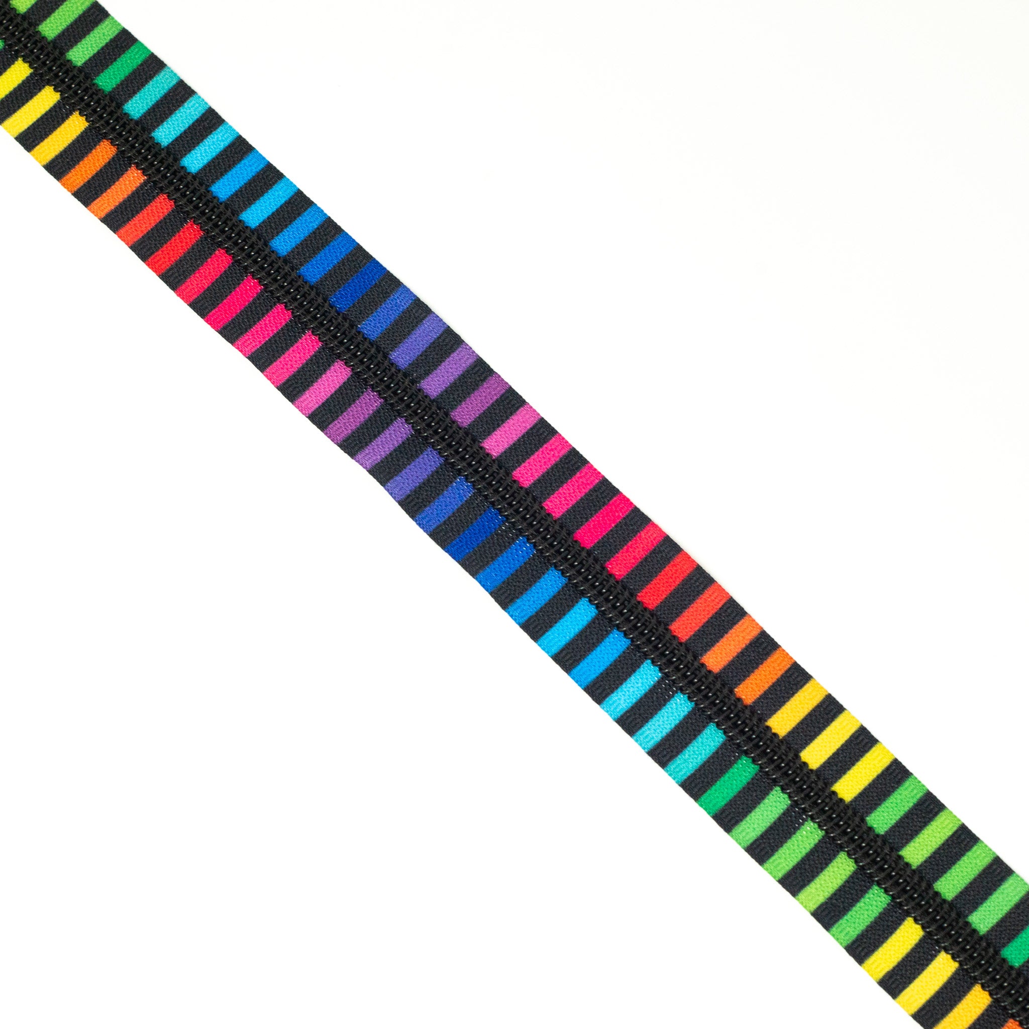 Rainbow ombre stripes size #5 black nylon coil zipper tape. Each quantity will be pre-cut to 3 metres in length. Multiple quantities of the same length will not be cut in 1 continuous piece. Our zipper tapes have the appearance of metal look teeth but are 100% nylon.