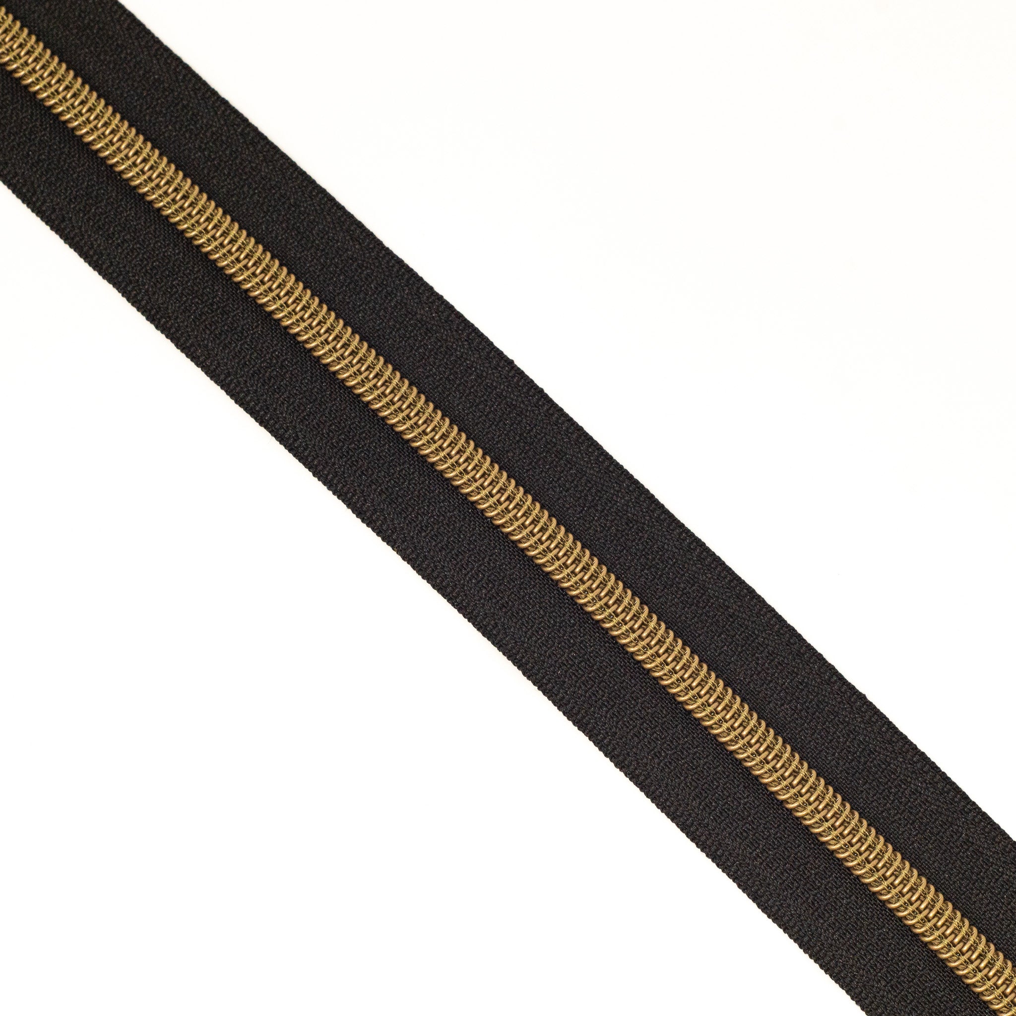 Black size #5 brass nylon coil zipper tape. Each quantity will be pre-cut to 3 metres in length. Multiple quantities of the same length will not be cut in 1 continuous piece. Our zipper tapes have the appearance of metal look teeth but are 100% nylon.