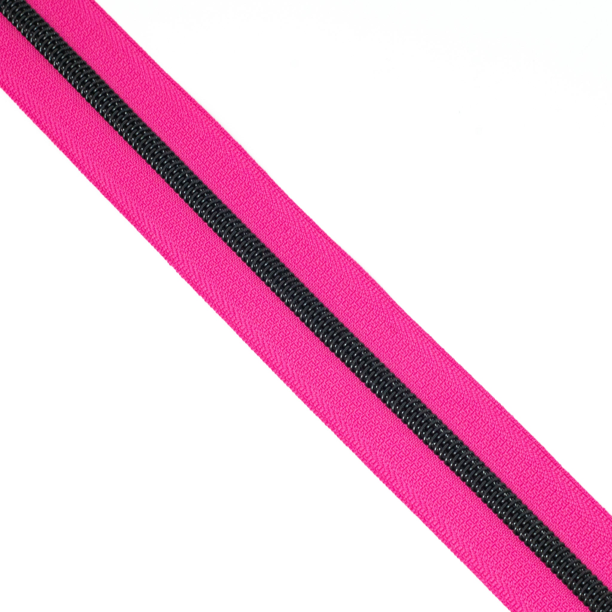 Hot Pink size #5 black nylon coil zipper tape. Each quantity will be pre-cut to 3 metres in length. Multiple quantities of the same length will not be cut in 1 continuous piece. Our zipper tapes have the appearance of metal look teeth but are 100% nylon.