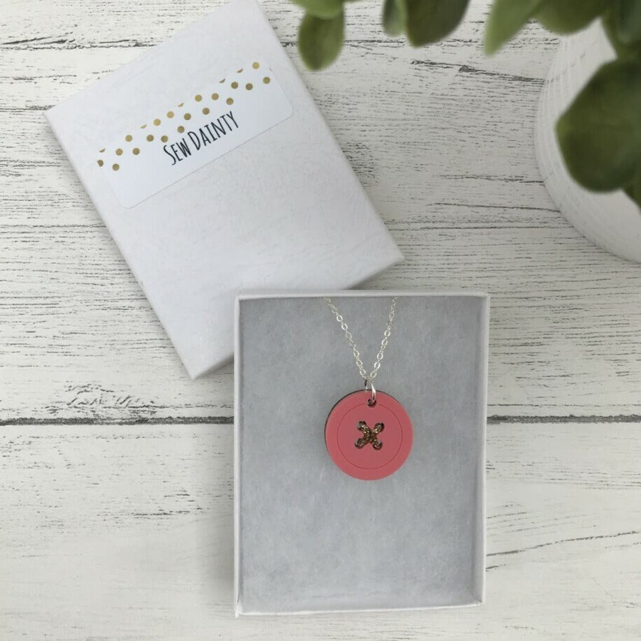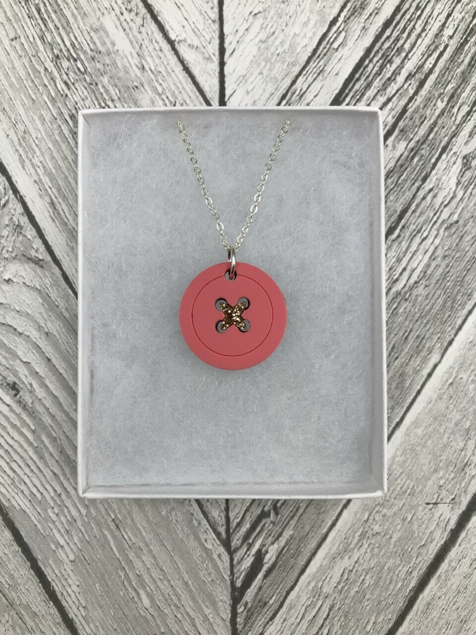 This button necklace is a pretty shade of pink with a matt finish features gold glitter thread on a varnished walnut backing.