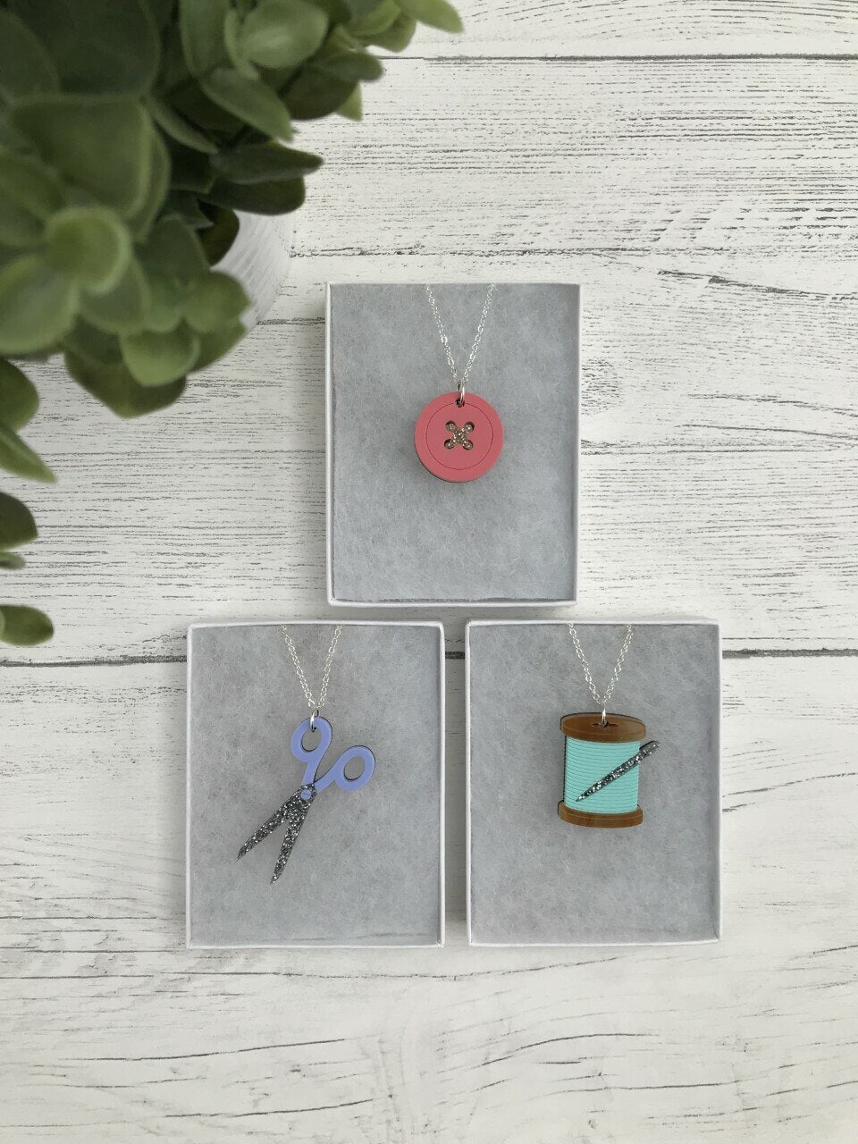 This adorable acrylic button necklace is the perfect accessory for every seamstress and would make the perfect sewing theme gift for your sewing friends or why not treat yourself.