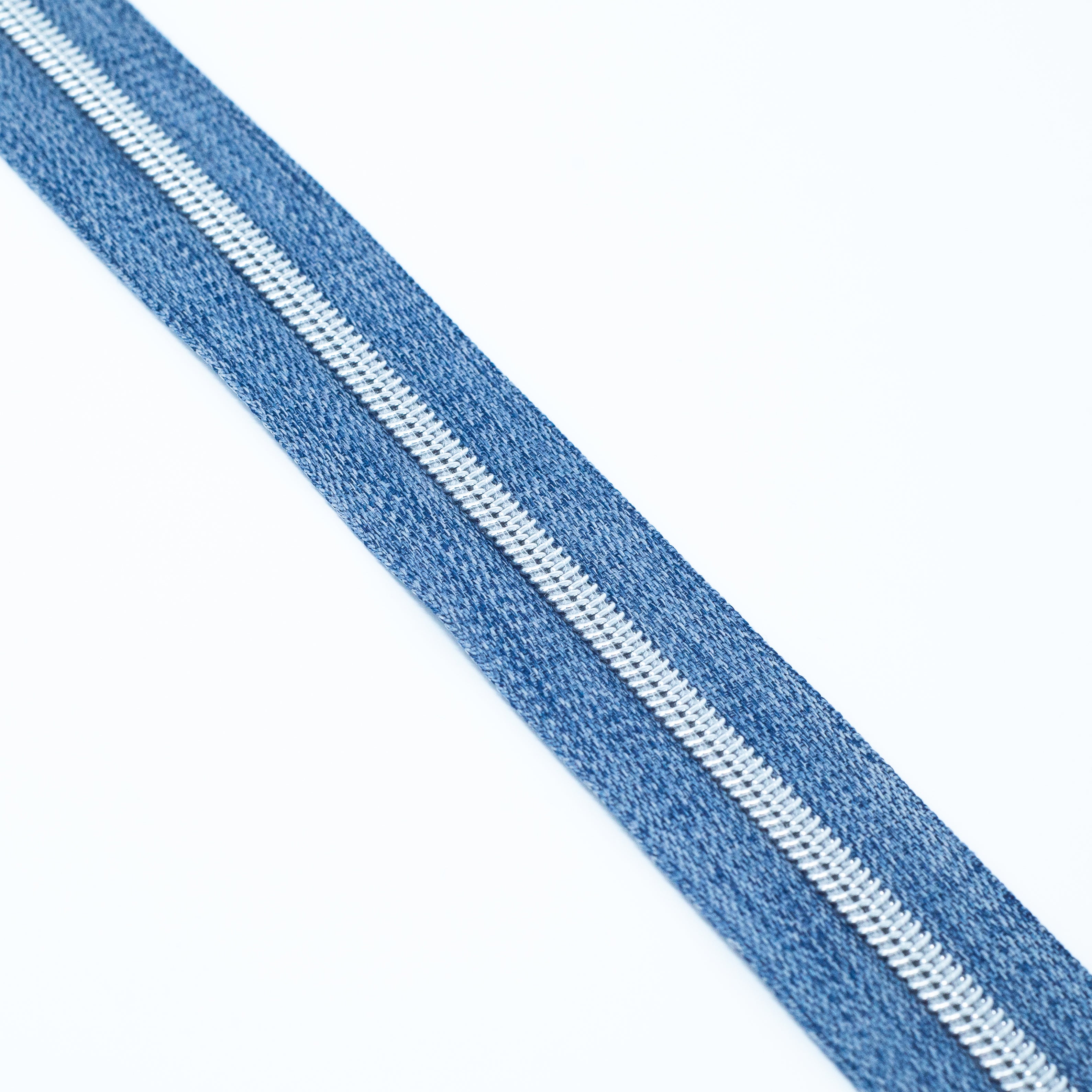 Blue denim size #5 silver nylon coil zipper tape. Each quantity will be pre-cut to 3 metres in length. Multiple quantities of the same length will not be cut in 1 continuous piece. Our zipper tapes have the appearance of metal look teeth but are 100% nylon.