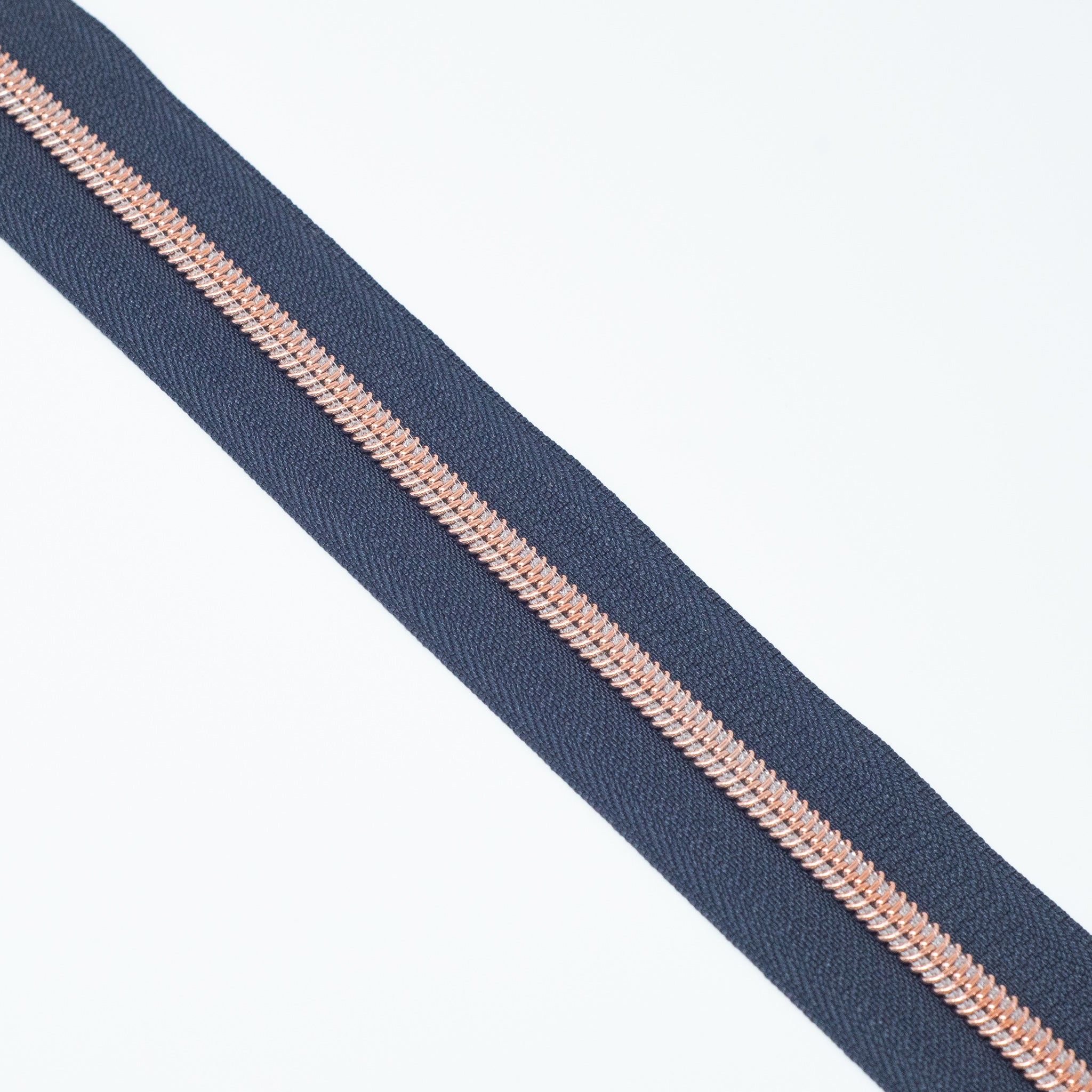 Dark blue size #5 rose gold nylon coil zipper tape. Each quantity will be pre-cut to 3 metres in length. Multiple quantities of the same length will not be cut in 1 continuous piece. Our zipper tapes have the appearance of metal look teeth but are 100% nylon.
