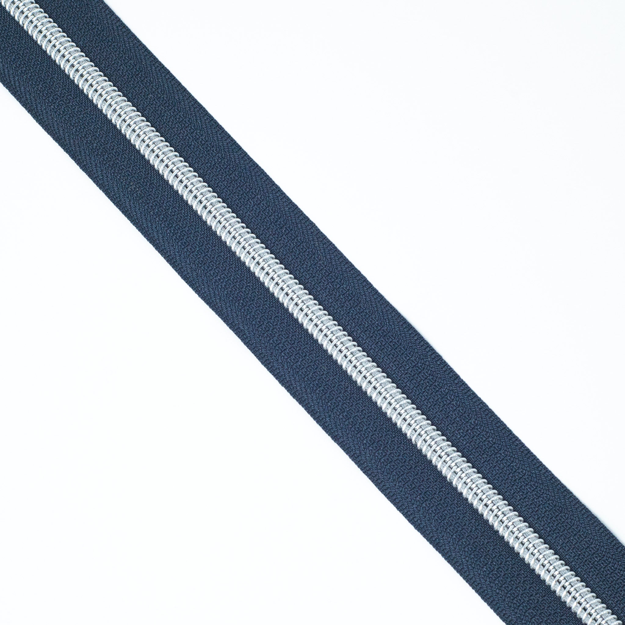 Dark blue size #5 silver nylon coil zipper tape. Each quantity will be pre-cut to 3 metres in length. Multiple quantities of the same length will not be cut in 1 continuous piece. Our zipper tapes have the appearance of metal look teeth but are 100% nylon.