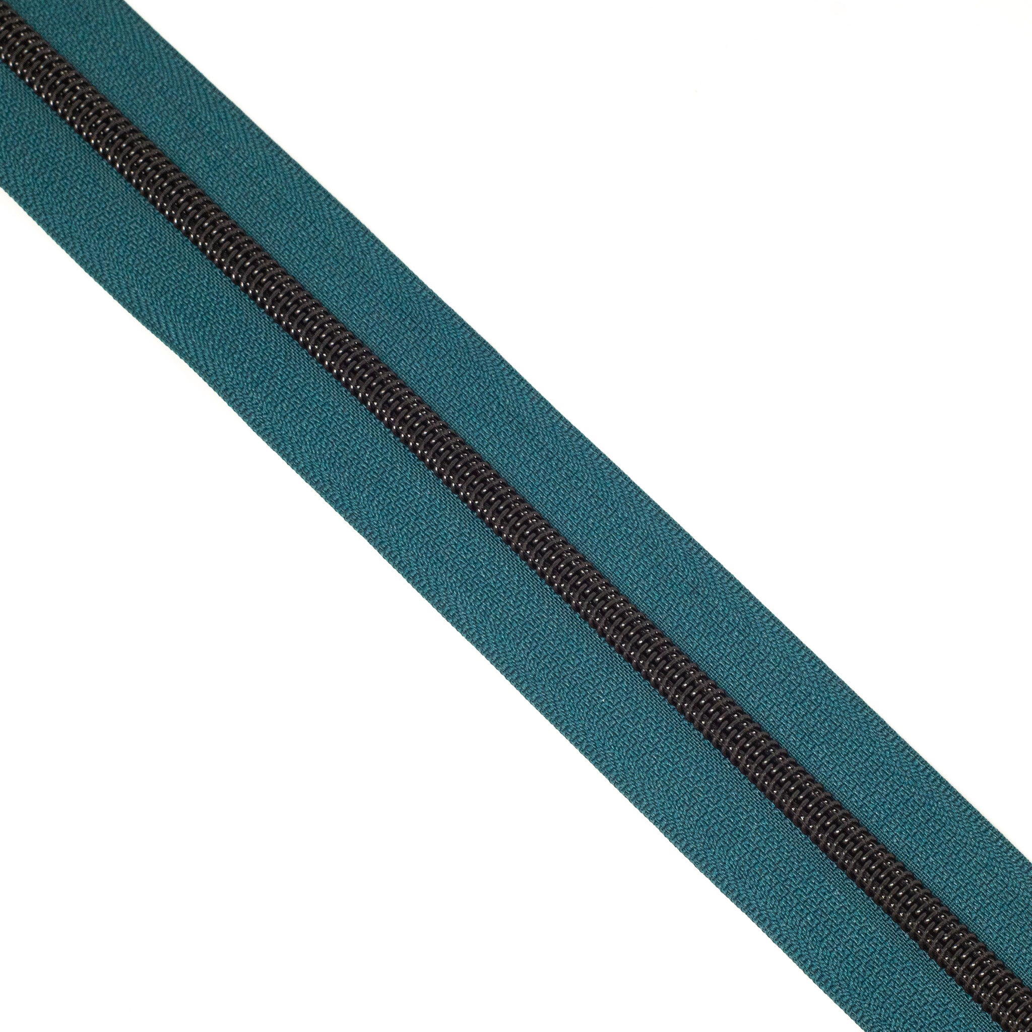 Teal size #5 black nylon coil zipper tape. Each quantity will be pre-cut to 3 metres in length. Multiple quantities of the same length will not be cut in 1 continuous piece. Our zipper tapes have the appearance of metal look teeth but are 100% nylon.