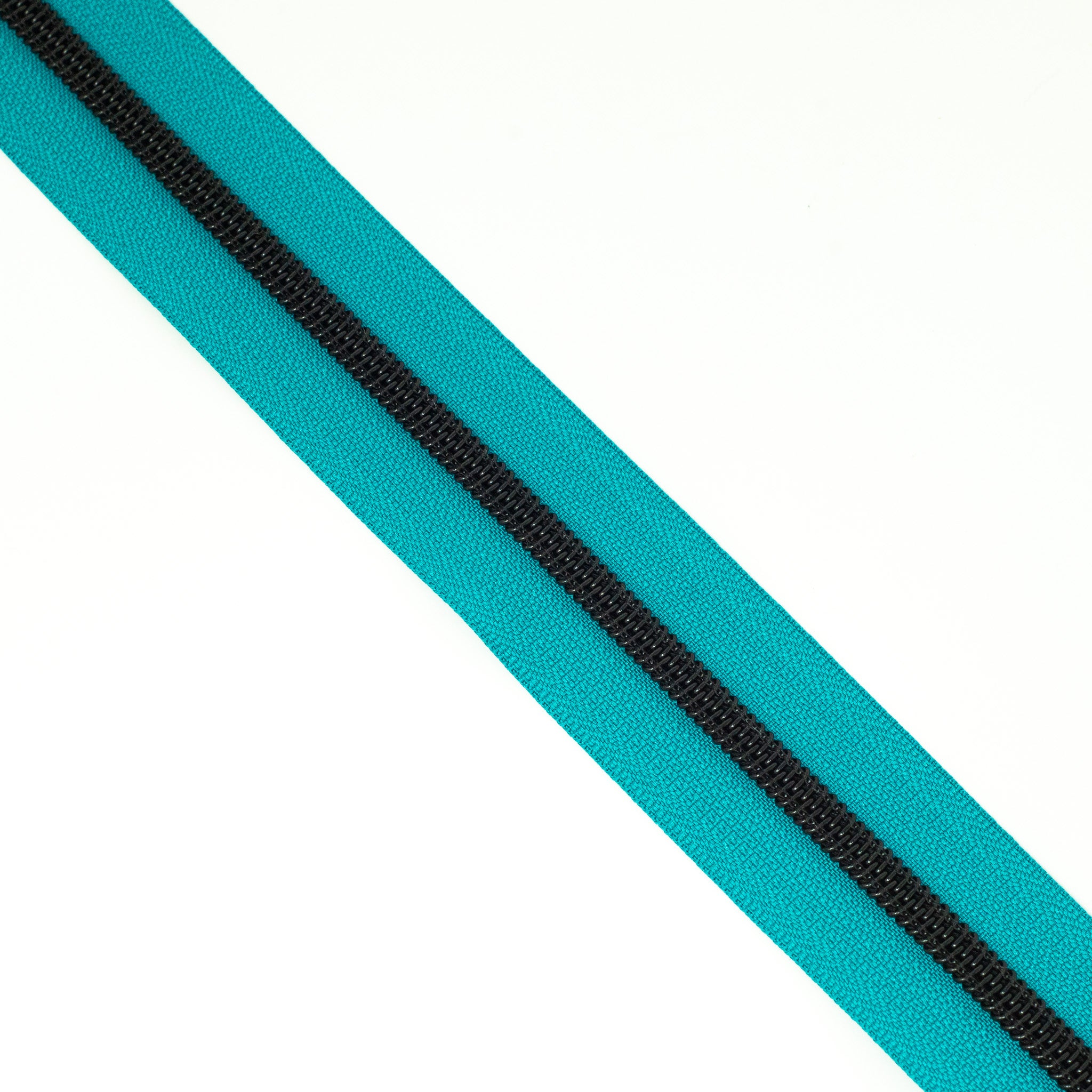 Turquoise size #5 black nylon coil zipper tape. Each quantity will be pre-cut to 3 metres in length. Multiple quantities of the same length will not be cut in 1 continuous piece. Our zipper tapes have the appearance of metal look teeth but are 100% nylon.