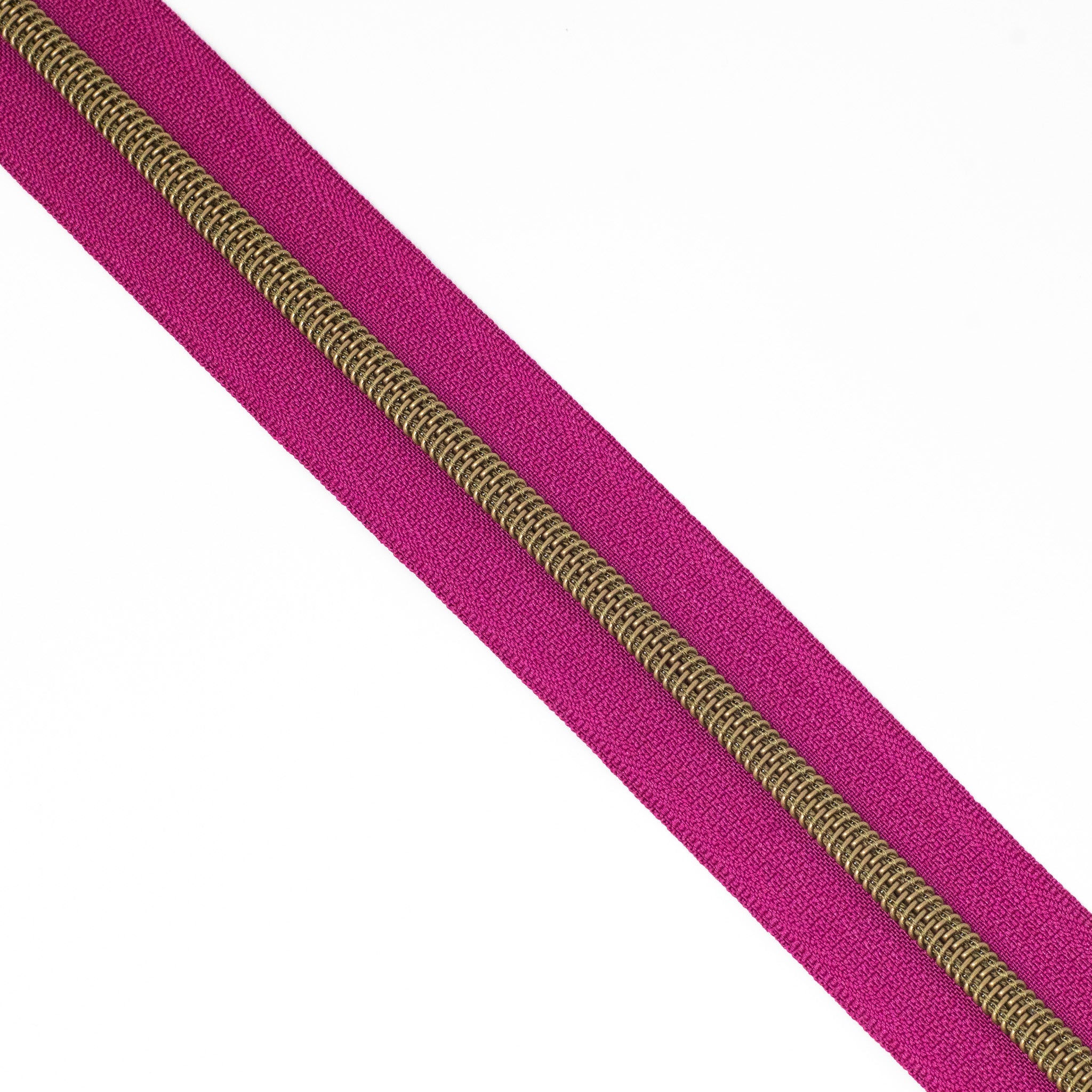 Berry size #5 brass nylon coil zipper tape. Each quantity will be pre-cut to 3 metres in length. Multiple quantities of the same length will not be cut in 1 continuous piece. Our zipper tapes have the appearance of metal look teeth but are 100% nylon.