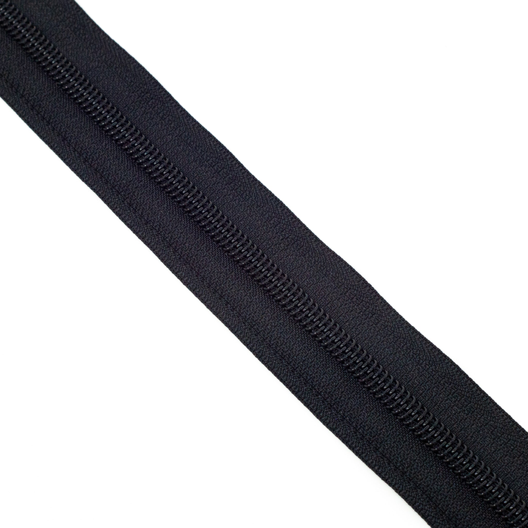 Black size #5 black nylon coil zipper tape. Each quantity will be pre-cut to 3 metres in length. Multiple quantities of the same length will not be cut in 1 continuous piece. Our zipper tapes have the appearance of metal look teeth but are 100% nylon.