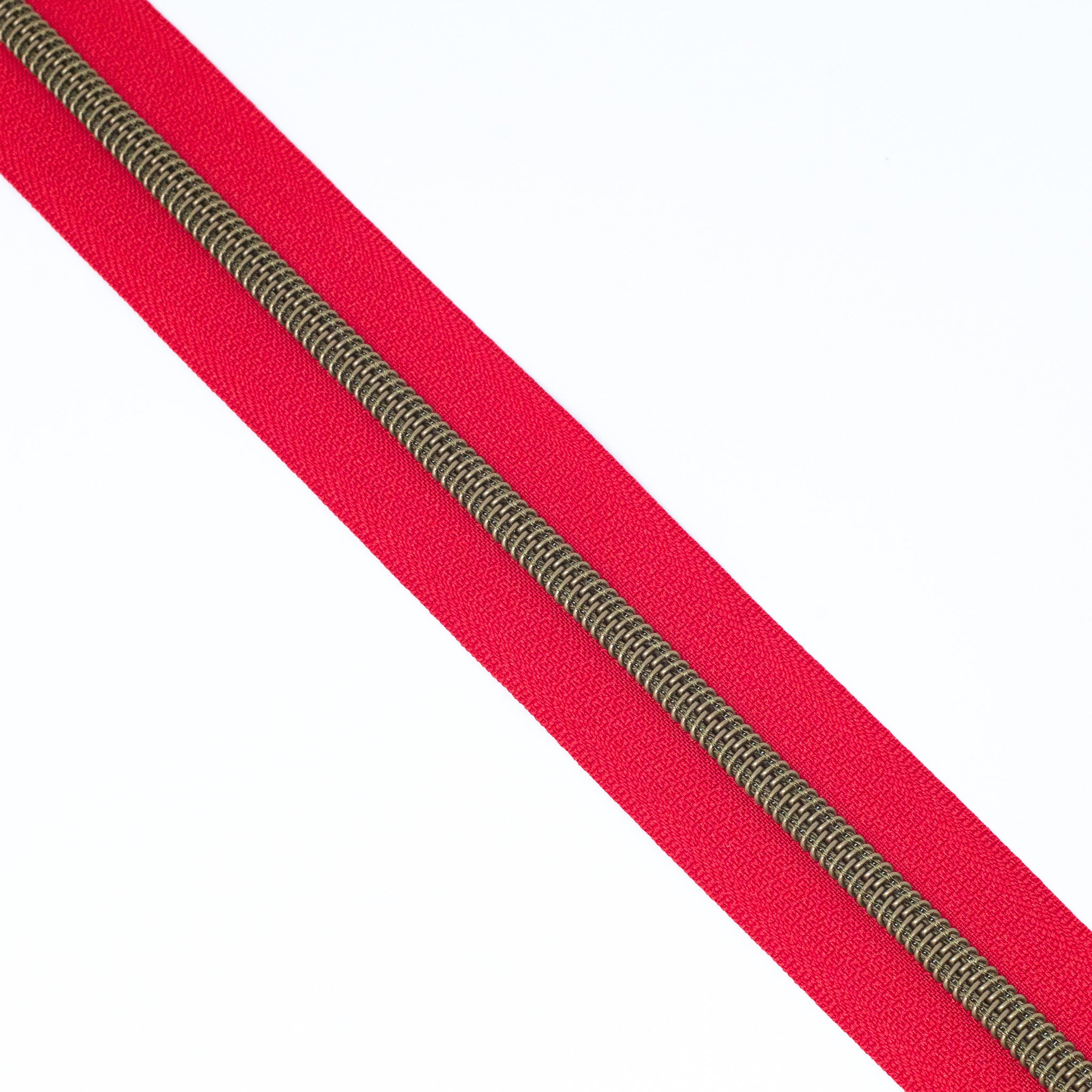 Bright Red size #5 brass nylon coil zipper tape. Each quantity will be pre-cut to 3 metres in length. Multiple quantities of the same length will not be cut in 1 continuous piece. Our zipper tapes have the appearance of metal look teeth but are 100% nylon.