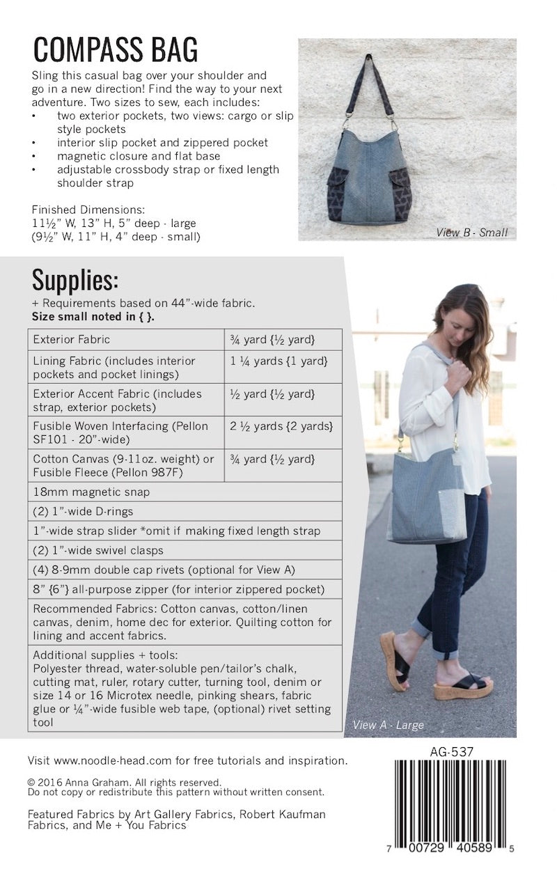 You will receive a instruction booklet with step-by-step instructions and professional illustration booklet. Includes full size pattern sheet, rotary cutting instructions/measurements all tucked into a resealable poly bag. Sling this casual bag over your shoulder and go in a new direction! Find the way to your next adventure. This casual crossbody bag has two types of easy access exterior pockets, plenty of roomy space inside, fun hardware, and two sizes to sew!