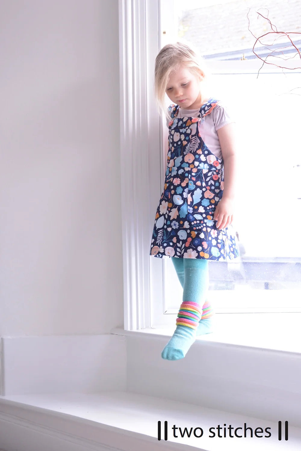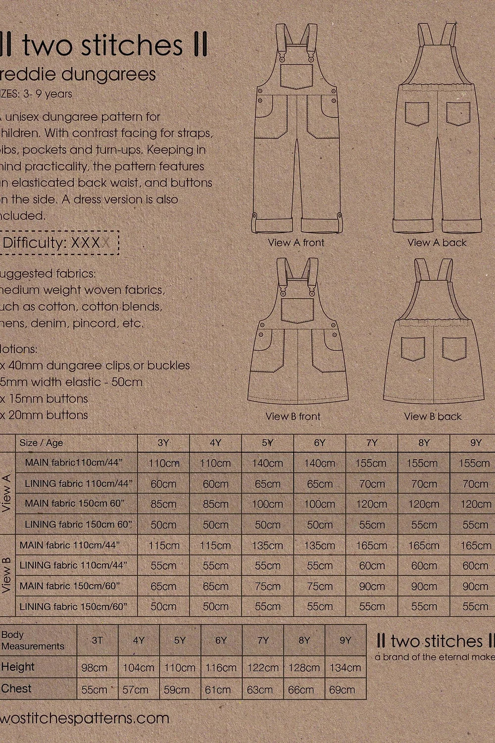 A unisex dungaree pattern for children. With contrast facing for straps, bibs, pockets and turn-ups. Keeping in mind practicality, the pattern features an elasticated back waist, and buttons on the side. A dress version is also included. You will receive a printed instruction booklet, with full paper pattern templates. Detailed pictures, and step by step instructions on how to make your own Freddie dungarees.