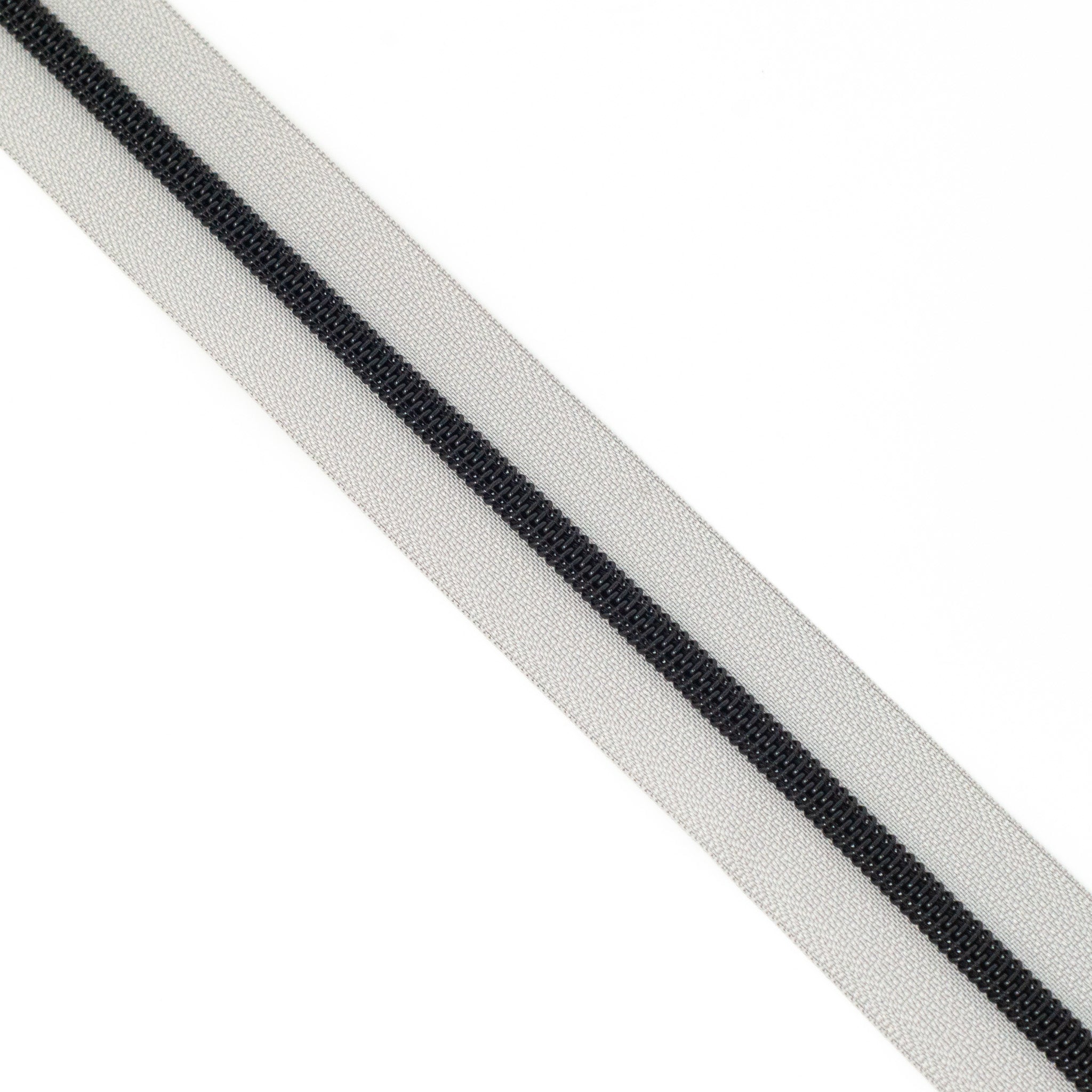 Light Grey size #5 black nylon coil zipper tape. Each quantity will be pre-cut to 3 metres in length. Multiple quantities of the same length will not be cut in 1 continuous piece. Our zipper tapes have the appearance of metal look teeth but are 100% nylon.