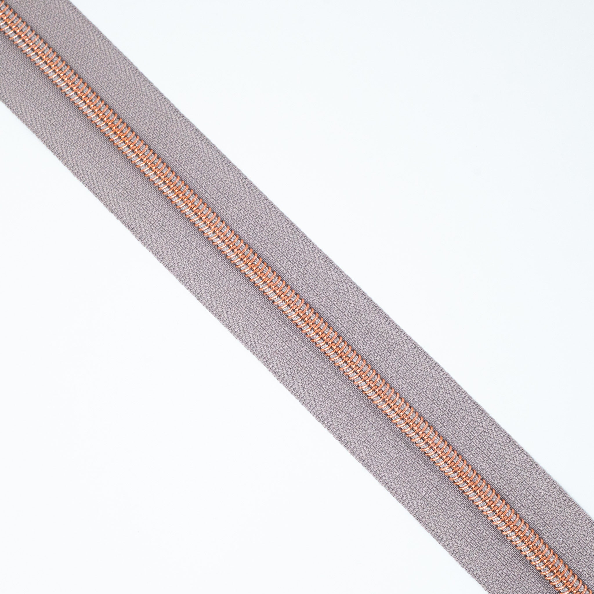 Light Heather size #5 rose gold nylon coil zipper tape. Each quantity will be pre-cut to 3 metres in length. Multiple quantities of the same length will not be cut in 1 continuous piece. Our zipper tapes have the appearance of metal look teeth but are 100% nylon.