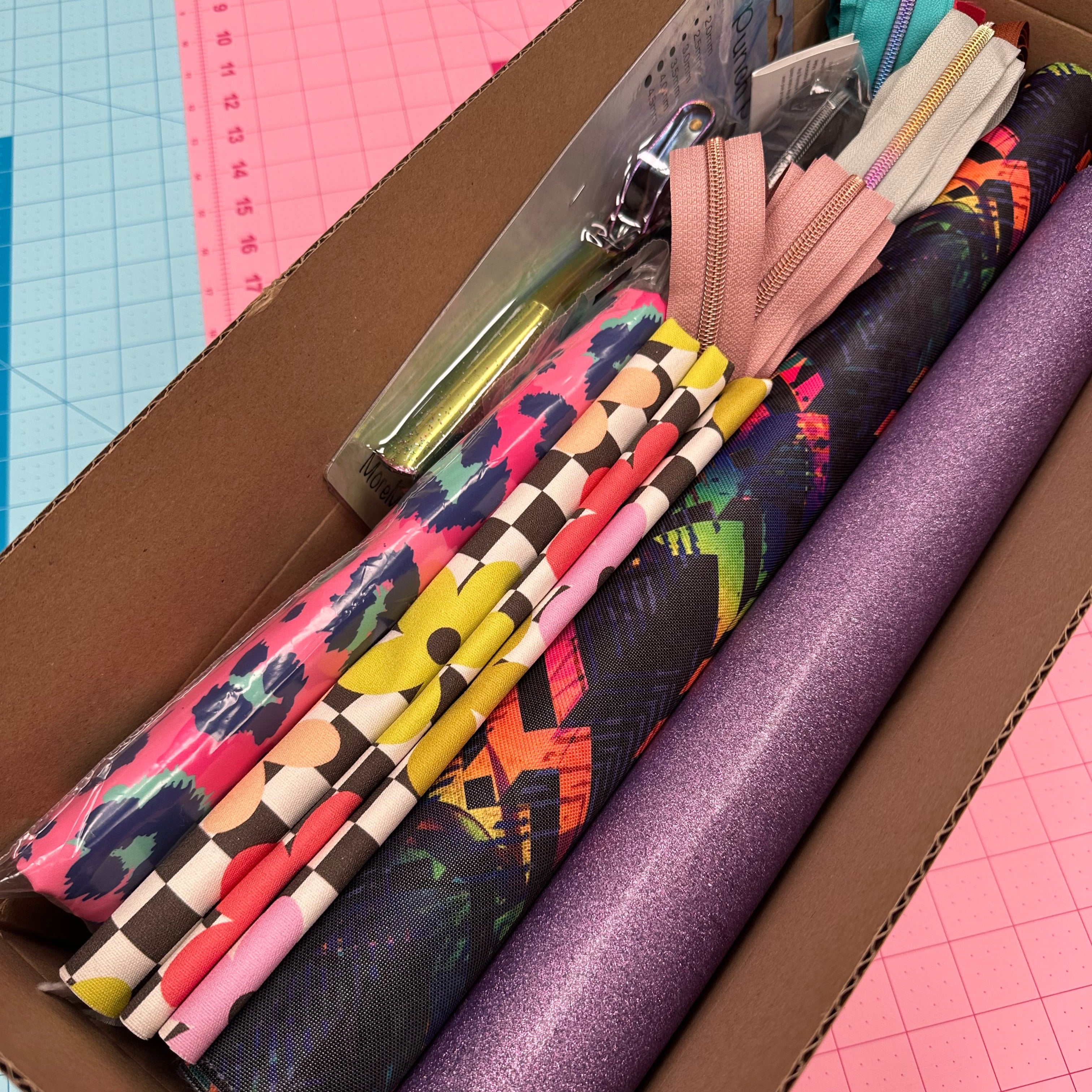 Mystery bag making supply boxes worth over £100 may include a mixture of fabrics, vinyl, hardware, webbing and zippers. They are great for beginner bag makers, practice pieces, craft projects or for anybody that wants a selection of bag making supplies at affordable price.