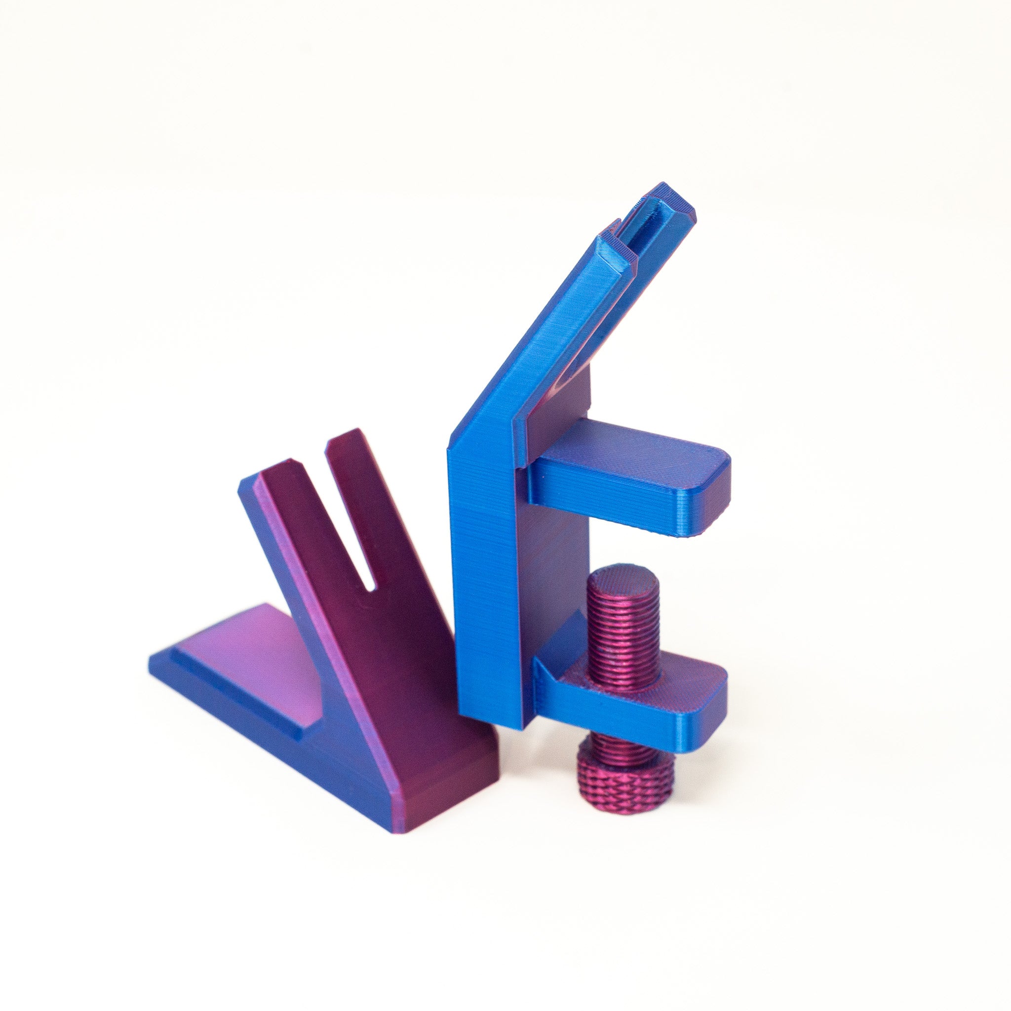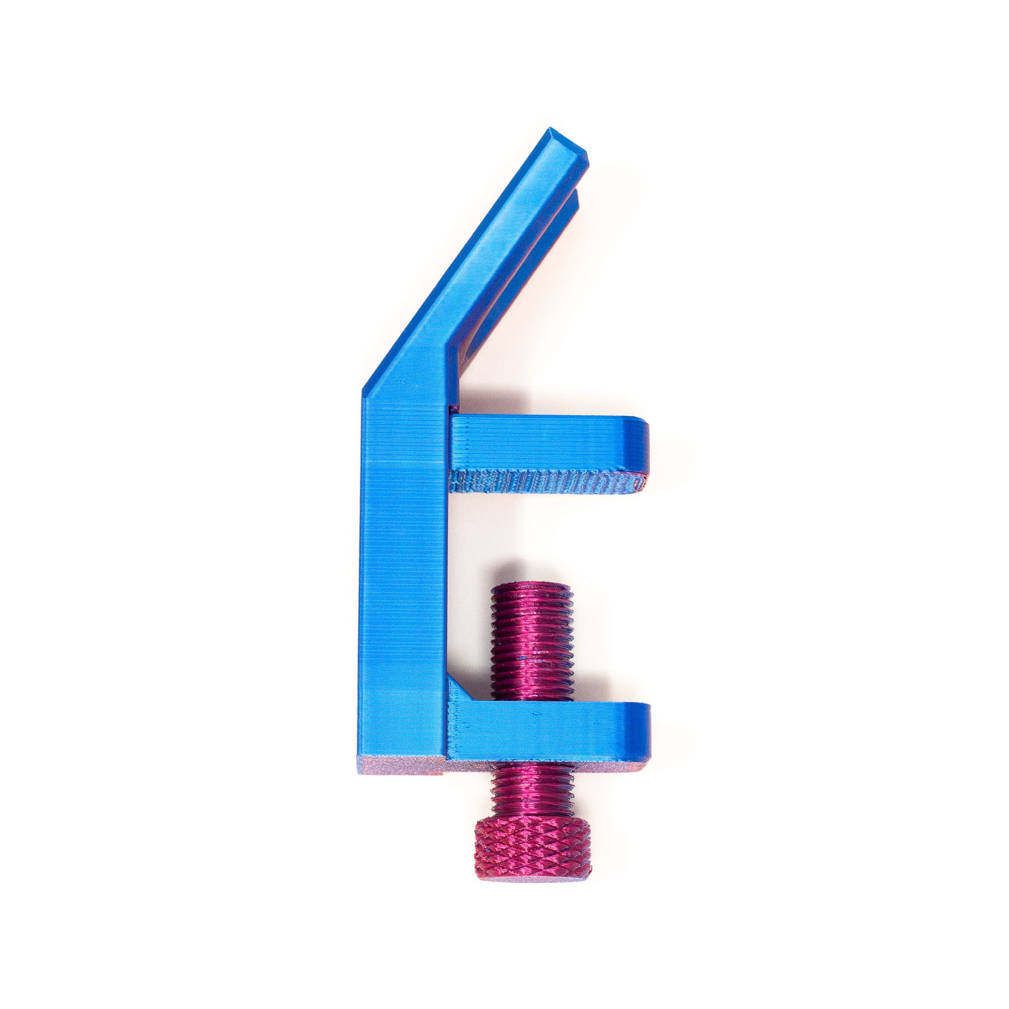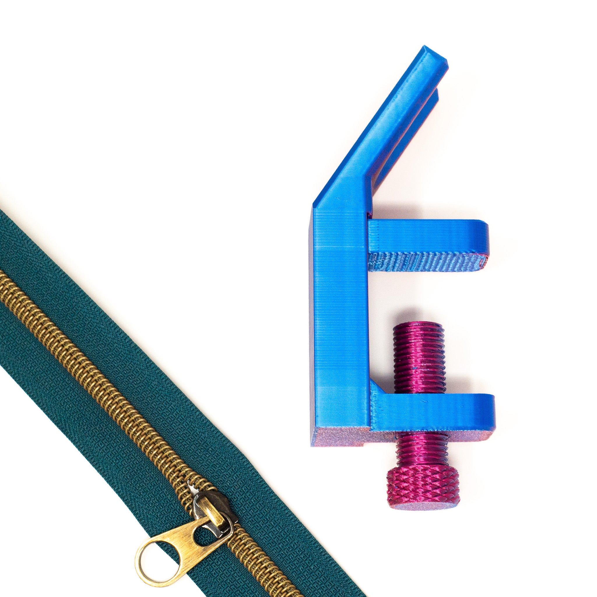 Struggle to add zipper pulls to zipper tape? This handy 3D printed table clamp zipper jig by Emi b designs helps you easily add zip pulls to zipper tape. This genius little tool is the perfect addition to add to your sewing room. Easily screw to your sewing table by screw to clamp. It can also be easily removed when not in use. Never again will you struggle to add zip pulls onto your zip tape. Duo chrome blue/magenta colour. Zipper tape and pull not included. Check out the other jig shape we sell here